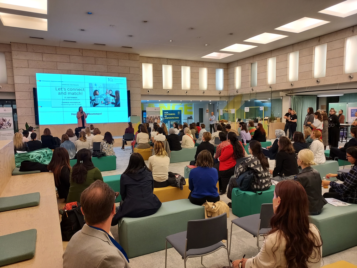 The aim of the Berlin “Konsortium für die bildungsadäquate Beschäftigung von Migrant*innen” [Consortium for migrant employment appropriate to one‘s level of education], part of the Berlin Regional Integration Network (RIN), in cooperation with the La Red migrant organisation project “Internationale Fachkräfte: Berlin (IF:B)” [International skilled workers: Berlin (IF:B)] was to develop an innovative format entitled “Let‘s connect and match!” for placing qualified skilled workers in jobs appropriate to their level of education. The plan was to focus, as an example, on women with experience of migration and of being a refugee. The aim was to instigate a paradigm shift with companies seeing international skilled workers in terms of the potential they have to offer and skilled workers receiving a fair opportunity and the space to present all aspects of themselves. The Consortium project created an interdisciplinary focus group in which, among others, projects from RIN Berlin, recognition and job training advice centres, migrant organisations, chambers of industry and commerce, employment agencies, job centres and companies were represented. The stakeholders identified structural and complex barriers on the path to employment appropriate to one’s level of education and in doing so focused on matching.