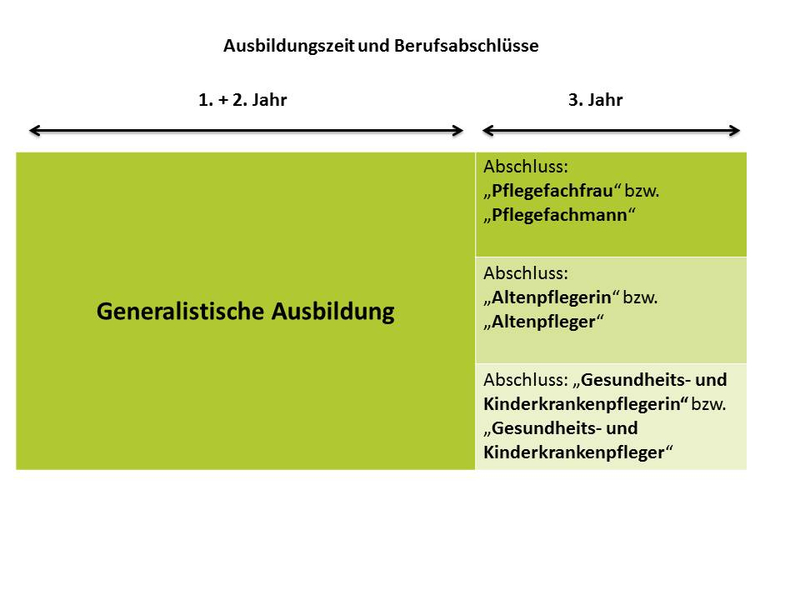 Durch die Reform werden die Ausbildungen in der Altenpflege, der Gesundheits- und Krankenpflege sowie der Gesundheits- und Kinderkrankenpflege zu einer neuen generalistischen Pflegeausbildung mit einheitlichem Berufsabschluss zusammengeführt. Durch die Berufsbezeichnung2 „Pflegefachmann“ bzw. „Pflegefachfrau“ wird die Zusammenführung der bisher getrennten Pflegeausbildungen auch sprachlich3 abgebildet. In der Ausbildung sollen übergreifende pflegerische Kompetenzen vermittelt werden, die zur Pflege von Menschen aller Altersgruppen in verschiedenen Versorgungsbereichen (z. B. Krankenhäuser, ambulante und stationäre Pflege) befähigen.