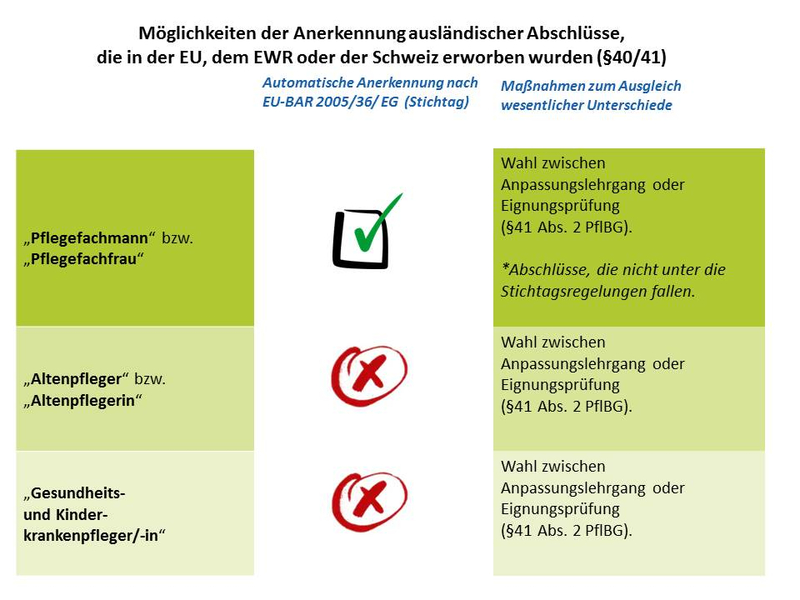 Für die berufliche Anerkennung eines im Ausland erworbenen Berufsabschluss in einem der spezialisierten Pflegeberufe ändert sich jedoch etwas mehr. In diesen Berufen ist eine automatische Anerkennung auch für in der EU/ EWR oder der Schweiz erworbene Abschlüsse nicht möglich.