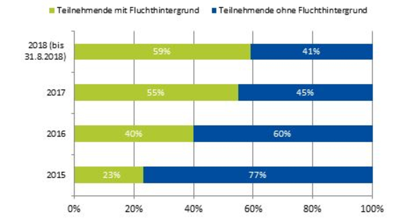 Fast 90 Prozent der Ingenieurinnen und Ingenieure können ein Sprachzertifikat vorweisen – davon etwa die Hälfte auf Niveau B1, etwa ein Drittel auf Niveau B2 und etwa 10 Prozent sogar auf C1-Niveau nach dem Gemeinsamen Europäischem Referenzrahmen (GER). Durchschnittlich werden Ingenieurinnen und Ingenieure im Förderprogramm rund sechs Monate lang qualifiziert. Die Zielgruppe wird zum Großteil (79 Prozent) in Präsenzangeboten qualifiziert, welche jedoch immer häufiger durch virtuelle Bestandteile ergänzt werden: Wurden 2015 nur rund 1 Prozent der Ingenieurinnen und Ingenieure in IQ durch ein Präsenzangebot mit virtuellen Bestandteilen geschult, so sind es im aktuellen Jahr (bis 31.8.2018) bislang bereits rund 17 Prozent.