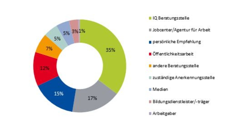 Betrachtet man die Zugangswege insgesamt, so wurde der Großteil der Teilnehmenden durch eine IQ Beratungsstelle auf das Qualifizierungsangebot aufmerksam. Aber auch das Jobcenter bzw. die Agentur für Arbeit sind für diese Zielgruppe relevante Akteure (siehe Abbildung 3).
