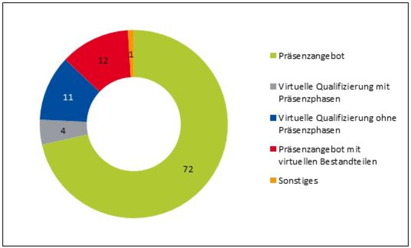 [5] N=1.914 - Da die Bedeutung der rein virtuellen Qualifizierungsmaßnahmen ohne Präsenzphasen seit 2016 durch Inkrafttreten der Verordnung über die berufsbezogene Deutschsprachförderung (DeuFöV) stark abgenommen hat, wird in der vorliegenden Graphik aus Gründen der Übersichtlichkeit auf die Angaben der rein virtuellen Qualifizierungen verzichtet.