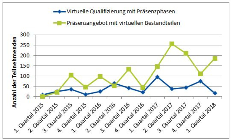 Insgesamt betrachtet setzt der Großteil (72 Prozent) der von IQ durchgeführten Maßnahmen auf reine Präsenzangebote. Der Trend zur Digitalisierung ist jedoch auch in IQ klar zu erkennen: Während im Jahr 2015 nur 79 neue Teilnehmende an virtuellen Qualifizierungen mit Präsenzphasen zu verzeichnen waren, stieg diese Zahl im Jahr 2017 bereits auf 255. Ähnlich stark ist der Anstieg bei den Präsenzangeboten mit virtuellen Bestandteilen von 173 Teilnehmenden in 2015 auf 722 im Jahr 2017. Auch im ersten Quartal 2018 besuchte bereits rund ein Viertel der Teilnehmenden ein Präsenzangebot mit virtuellen Anteilen (siehe Abbildung 2).