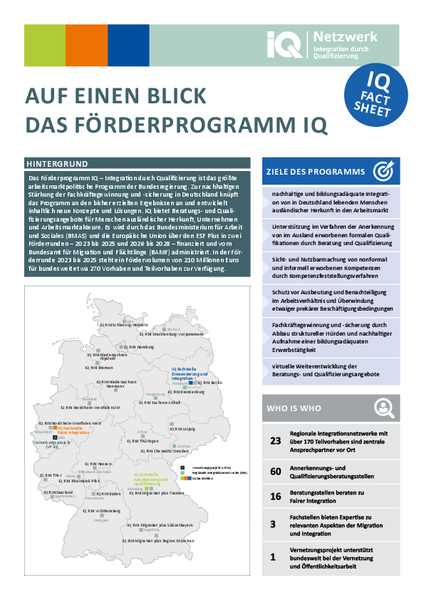 - "Auf einen Blick - das Förderprogramm IQ" stellt die Ziele, Akteure und Schwerpunkte des größten arbeitsmarktpolitischen Programms der Bundesregierung vor. Zur nachhaltigen Stärkung der Fachkräftegewinnung und -sicherung in Deutschland knüpft das Programm an den bisher erzielten Ergebnissen an und entwickelt inhaltlich neue Konzepte und Lösungen. Das Fact Sheet zeigt überdies, welche Beratungs- und Qualifizierungsangebote IQ für Menschen ausländischer Herkunft, Unternehmen und Arbeitsmarktakteure bietet.