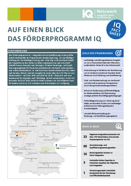 - "Auf einen Blick - das Förderprogramm IQ" stellt die Ziele, Akteure und Schwerpunkte des größten arbeitsmarktpolitischen Programms der Bundesregierung vor. Zur nachhaltigen Stärkung der Fachkräftegewinnung und -sicherung in Deutschland knüpft das Programm an den bisher erzielten Ergebnissen an und entwickelt inhaltlich neue Konzepte und Lösungen. Das Fact Sheet zeigt überdies, welche Beratungs- und Qualifizierungsangebote IQ für Menschen ausländischer Herkunft, Unternehmen und Arbeitsmarktakteure bietet.